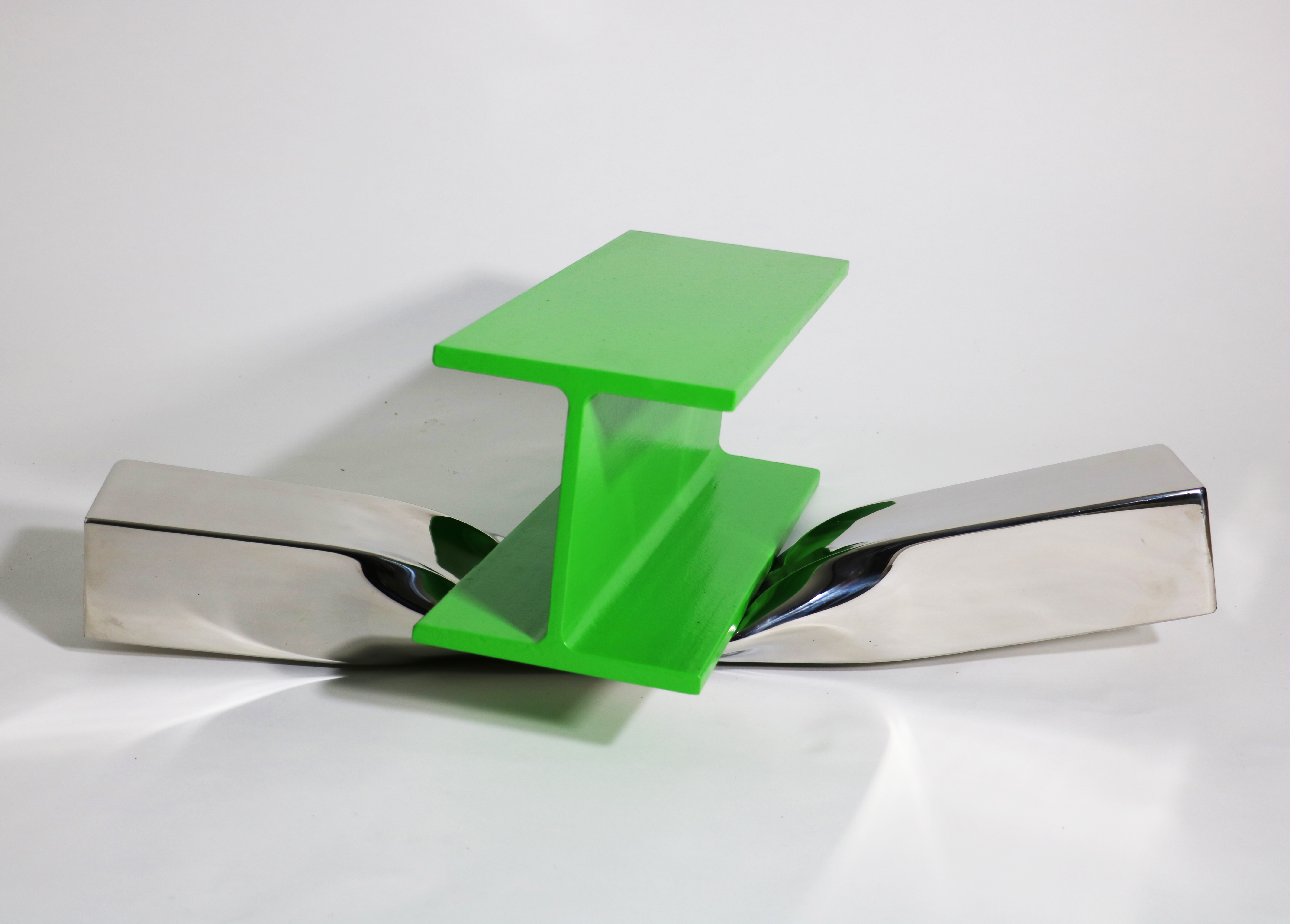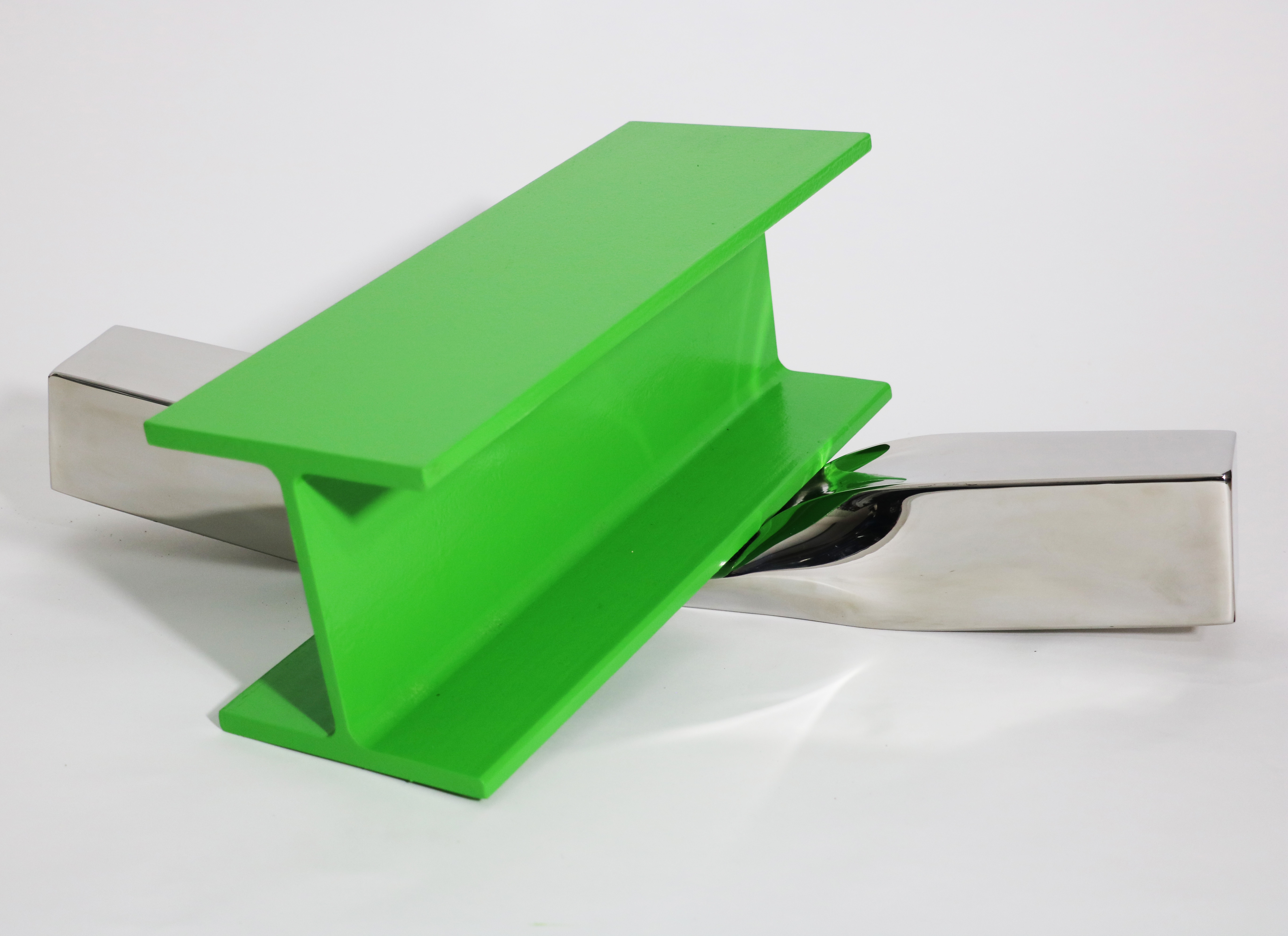 The Crush series are based on fictitious actions or events in which I-beams have appeared to have landed on bars of stainless steel. Intense colour and polishing gives the work an unreal quality, allowing it to sit in the space between finish and failure.